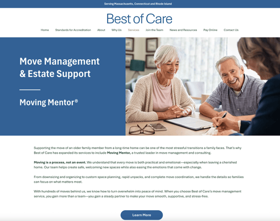 “The goal was to bring Tucked-In Elder Care and our move management arm under that proverbial roof. We still have Moving Mentor, as a name, because it's a great name that has a lot of brand recognition dating back to when we bought it,” Smith added. “It was important to me that their font, look, and color was consistent with everything else. Even at face value, it’s easy to identify it as part of Best of Care.”